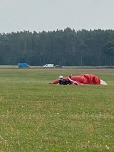 Die Landung Deines Fallschirmsprunges geht im Normalfall sehr entspannt von statten. Hier ist es wichtig, dass Du die Füße hochhebst und dem Tandempiloten seine Arbeit machen lässt. Dann kann auch nichts passieren.